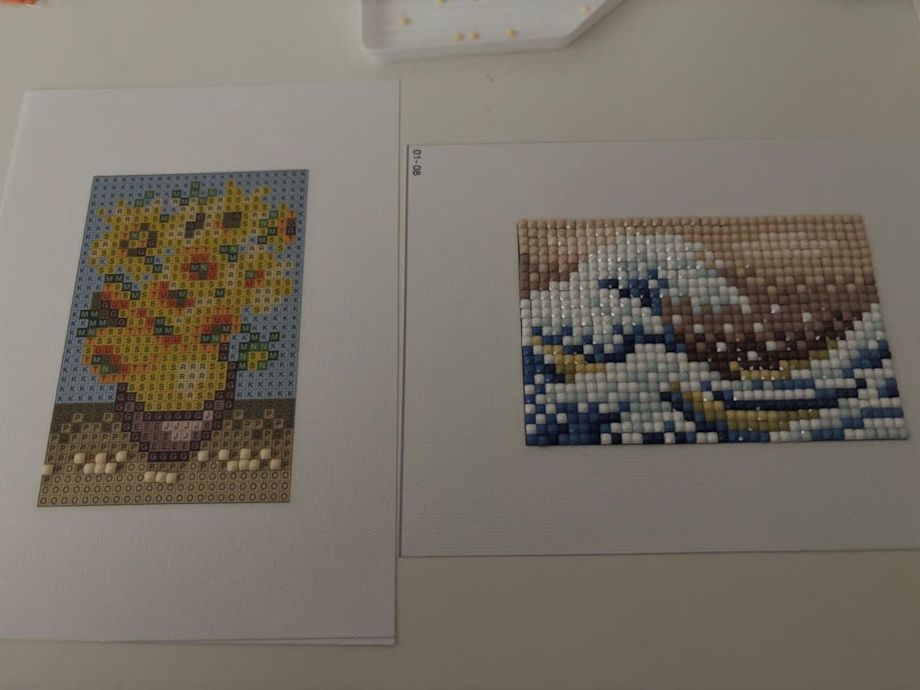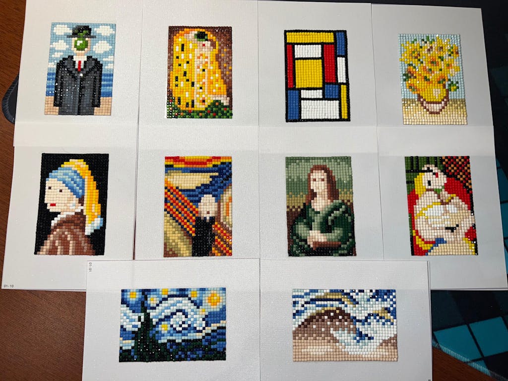 The Son of Man (René Magritte), The Kiss (Klimt), Composition (Mondrian), The Scream (Edvard Munch), Girl with pearl earrings (Vermeer), Sunflowers (Van Gogh), Mona Lisa (Da Vinci), Starry Night (Van Gogh), The Great Wave Off Kanagawa (Hokusai).