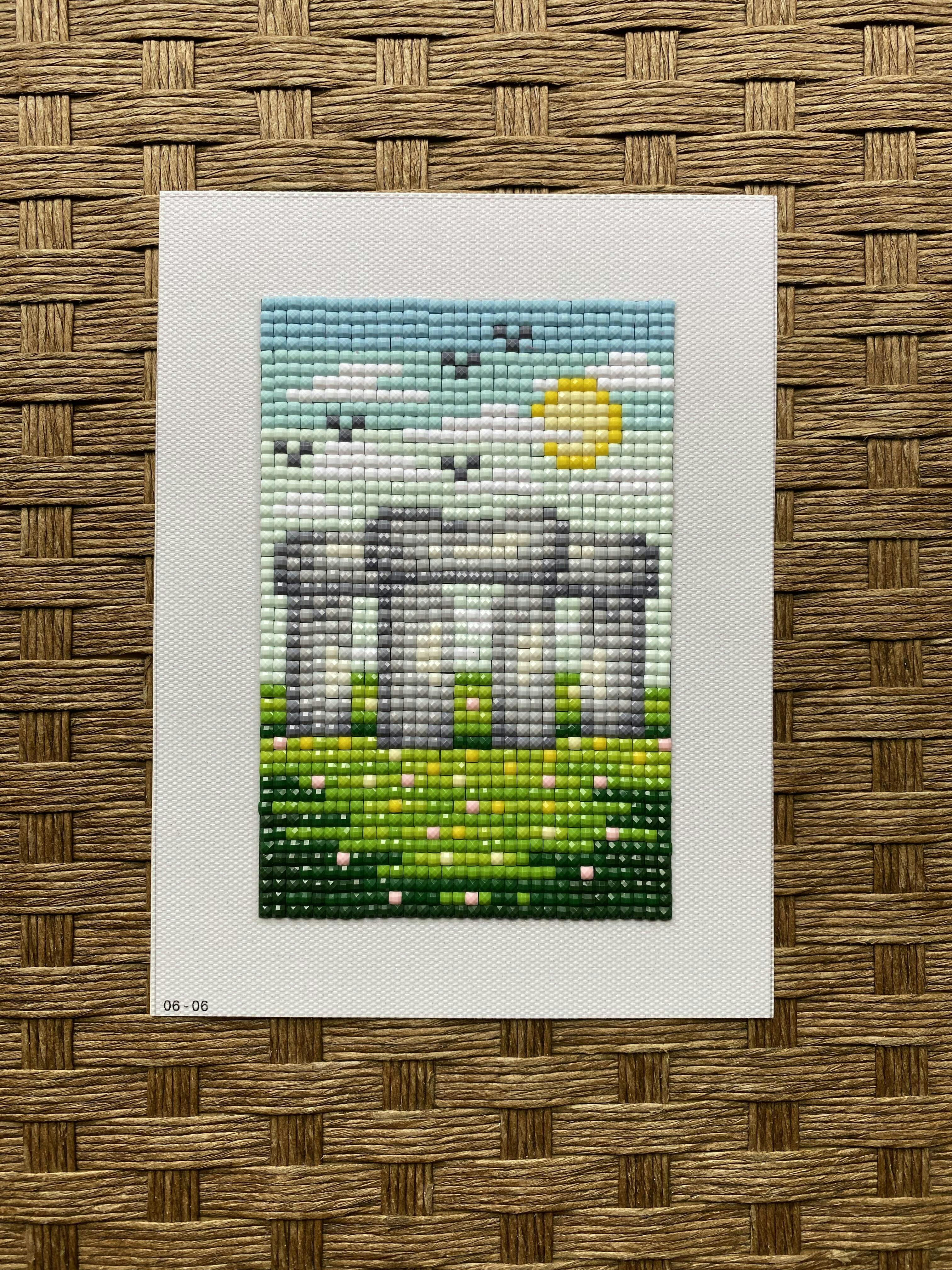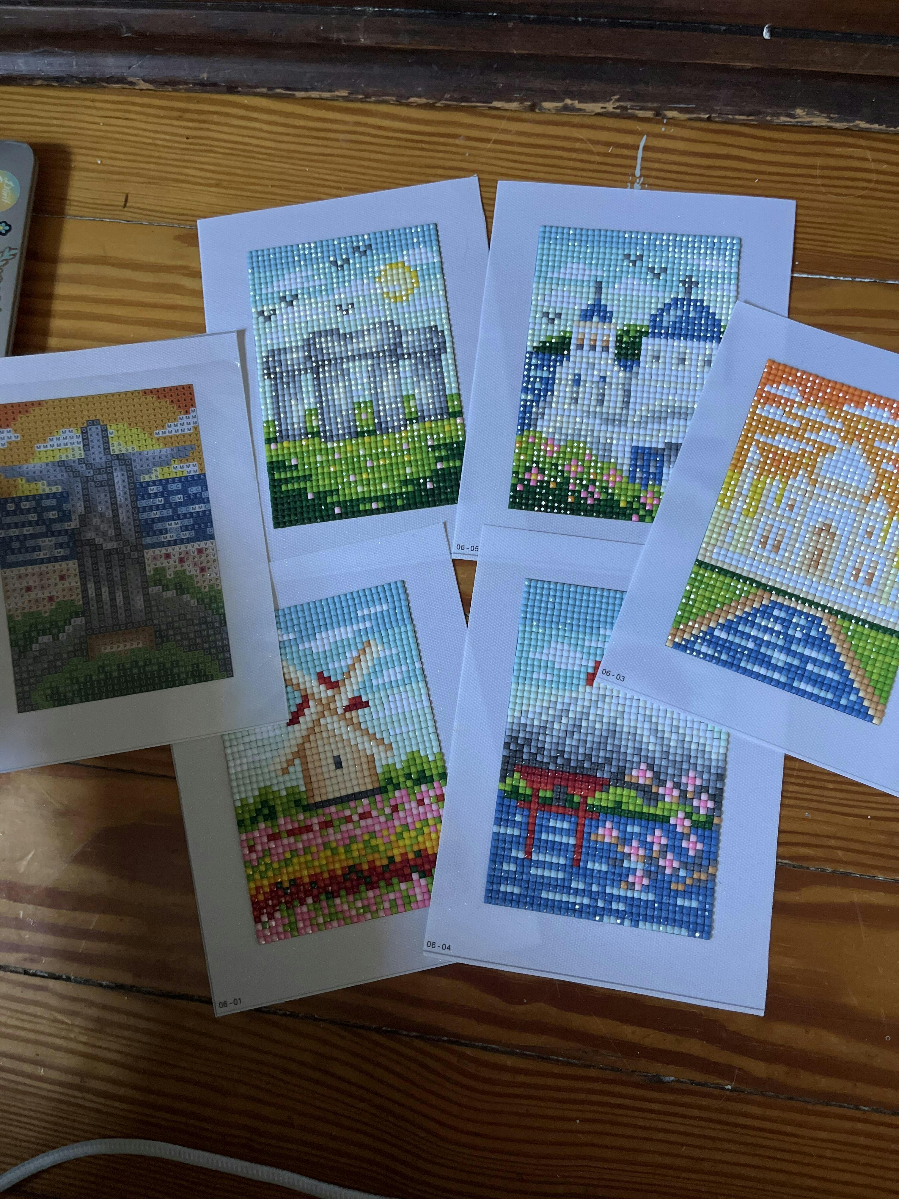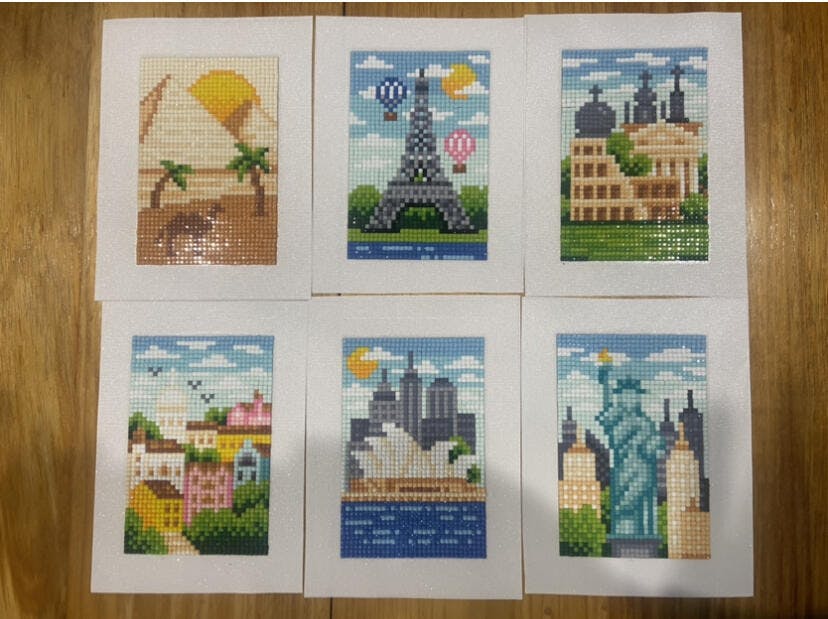 This set includes 6 canvases, 9,216 gems in 30 colors and tools to complete the entire set