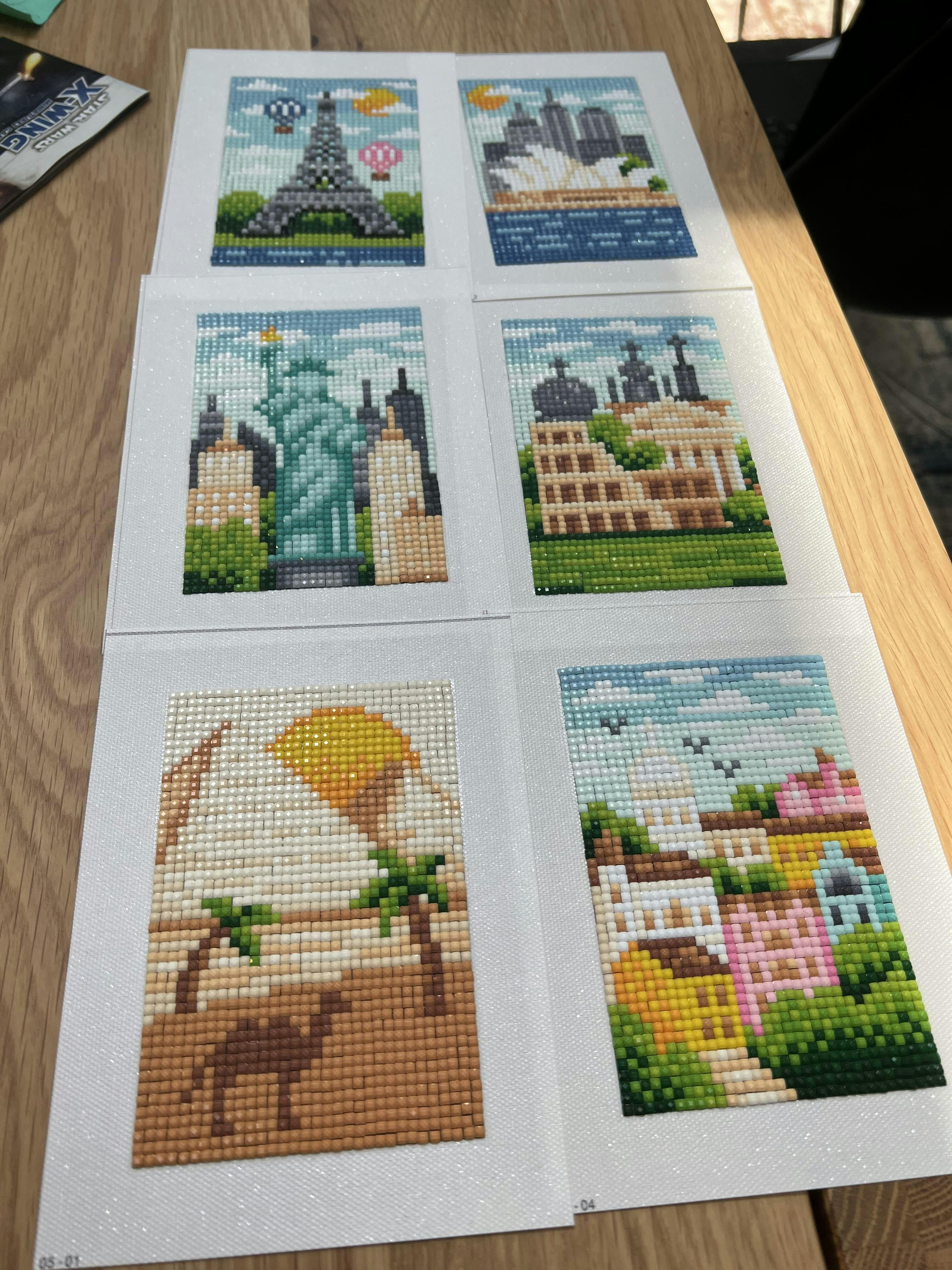 This set includes 6 canvases, 9,216 gems in 30 colors and tools to complete the entire set