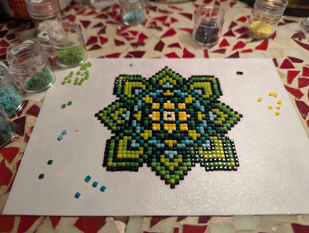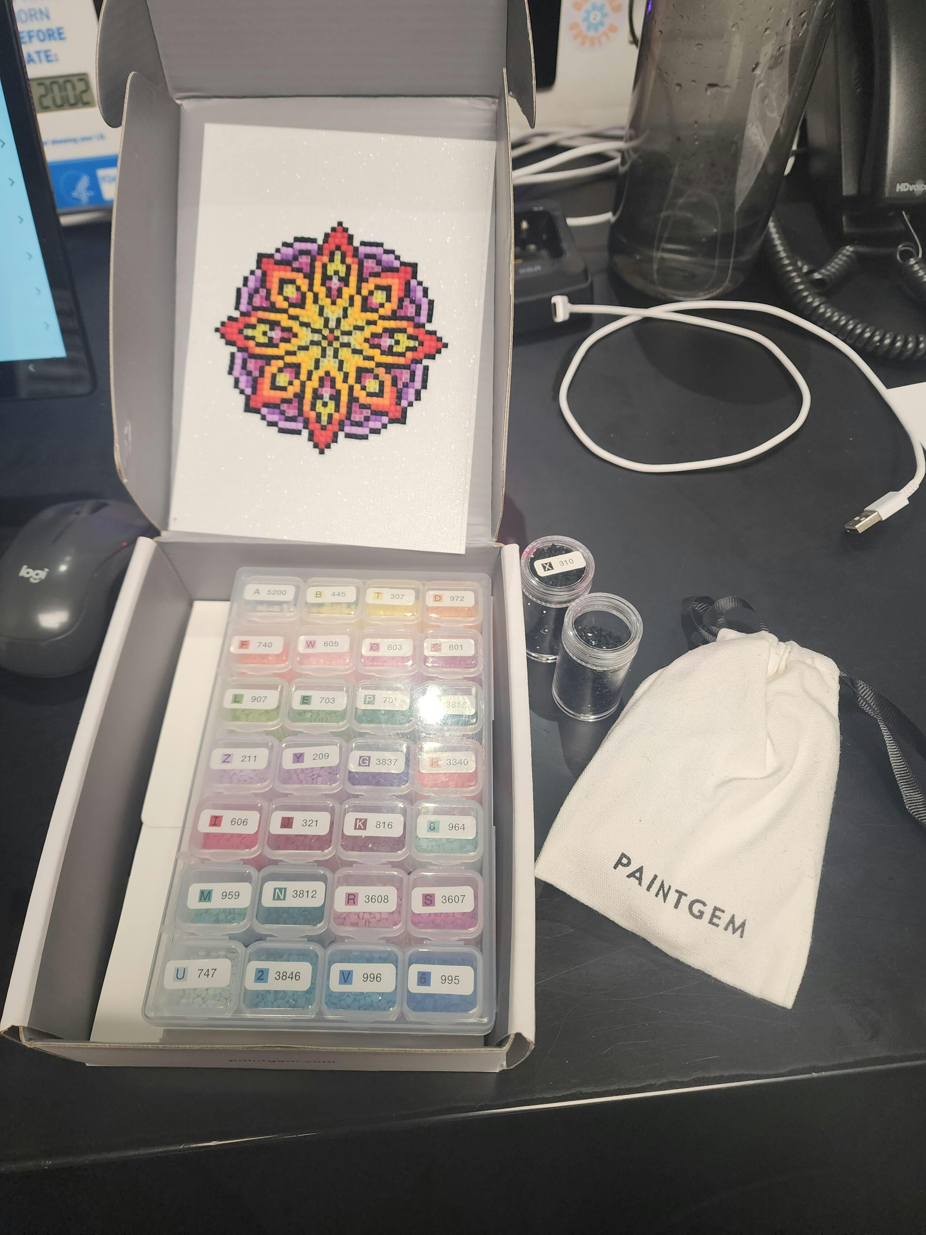 This set includes 12 canvases, 12,421 gems in 30 colors and tools to complete the entire set