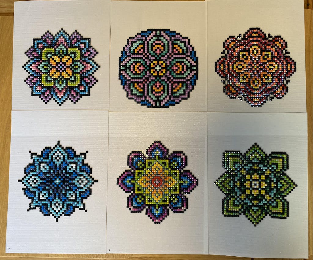 This set shows the beauty and intricacy that can be achieved through the ancient art of mandalas. Each mandala is a unique work of art, featuring different symmetrical patterns with vibrant colors.