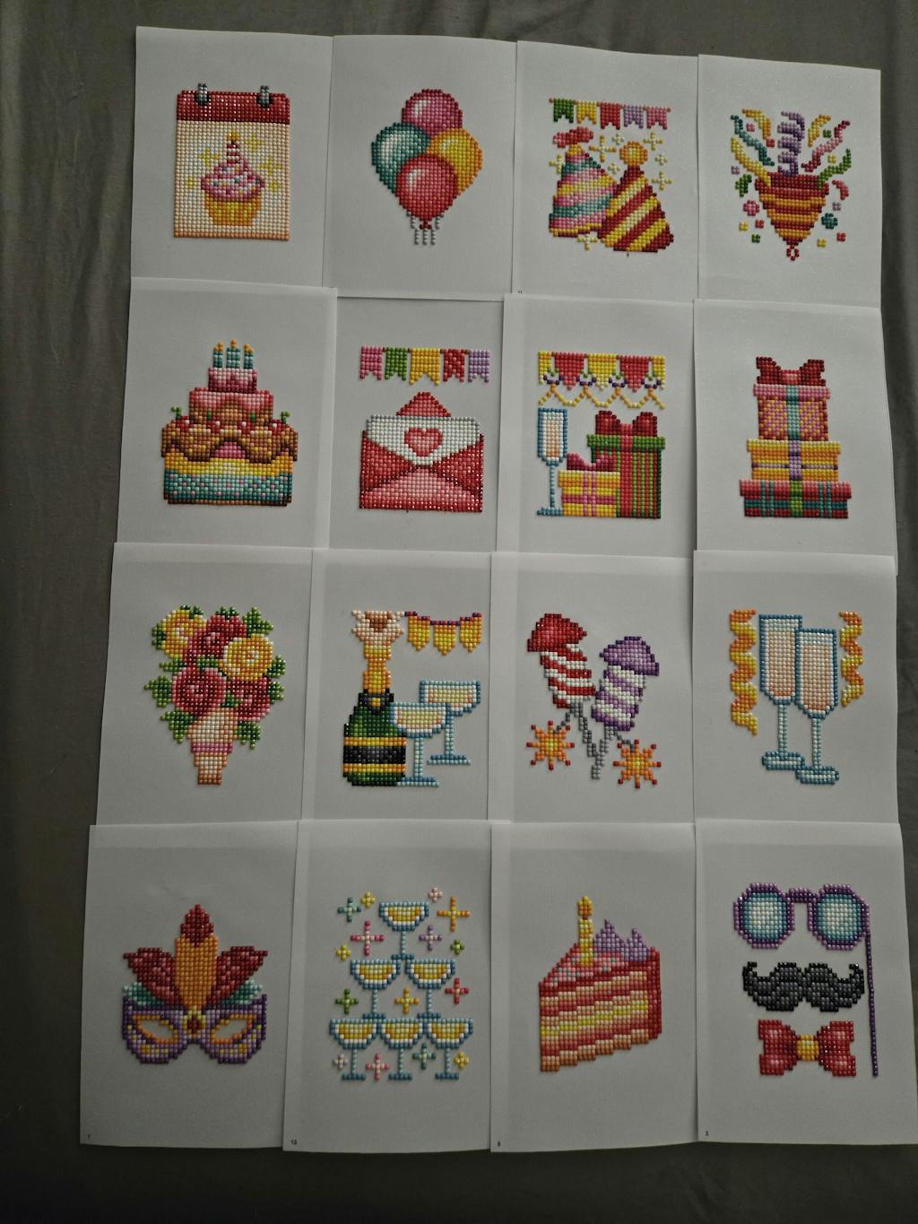 Party Hats, Champagne Glasses, Balloons, Love Letter, Poppers, Cake, Photo Props, Mask, Bouquet, Calendar, Cake Slice, Piñata, Gifts, Champagne Tower, Wrapped Gifts, Champagne Bottle.